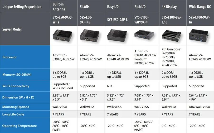 星宏推出的超微嵌入式超级服务器,针对客户的物联网或嵌入式应用程序优化的多种外形规格,极具竞争力的性价比,同时提供超静音、低功耗操作。以下是不同规格类型的简单介绍: